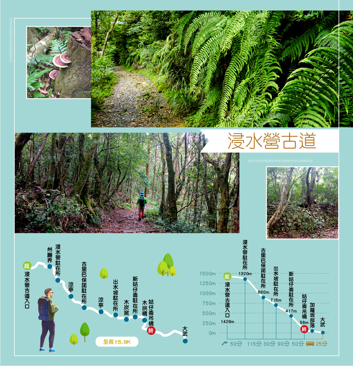 西起屏東枋寮,橫越中央山脈至臺東,是一條越嶺點最低、使用頻率最高、且壽命最長的古道。古道海拔落差介於200公尺~1,450公尺之間,可遠眺南北大武山,全長約15.9公里,古道上現存的人文遺址包括有「姑仔崙舊社」、「力里社」、「歸化門社」、「出水坡遺址」、「浸水營清代營盤址」、「浸水營日警駐在所」,以及木炭窯和舊鐵線橋墩等多處遺跡。